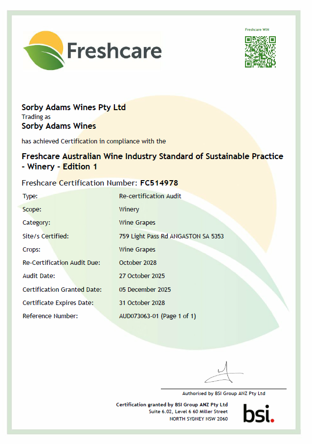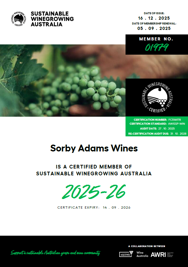 Sorby Adams is certified Sustainable Winegrowing Australia Winery.